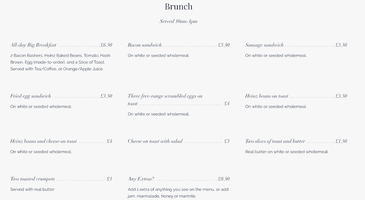 - Brunch Highlights: Indulge in an All-Day Big Breakfast or a classic Fried Egg Sandwich. For a lighter bite, try the Two Toasted Crumpets or the cheerful Heinz Beans on Toast.
